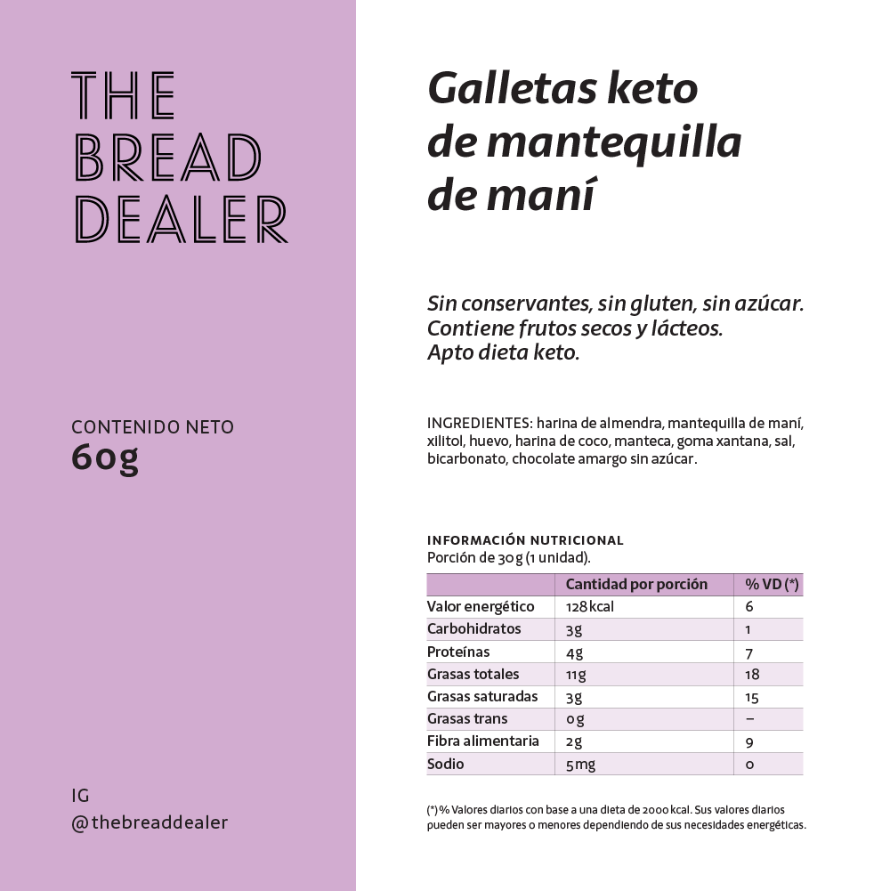 Las galletas están elaboradas con: harina de almendra, mantequilla de maní, xilitol, huevo, harina de coco, manteca, goma xantana, sal, bicarbonato, chocolate amargo sin azúcar.